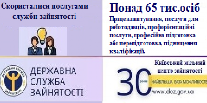 Протягом 2020 року послугами столичної служби зайнятості скористалися понад 65 тис. осіб, які шукали роботу, з них більш ніж 52 тис. мали статус зареєстрованого безробітного. За сприяння Київського міського центру зайнятості було забезпечено роботою понад 14 тис. громадян.