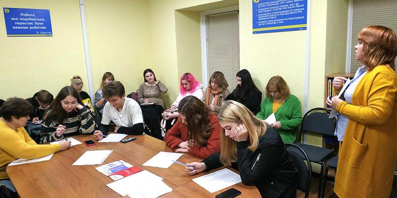 У рамках профорієнтаційного фестивалю «ПРОФFЕST-2019» фахівці Дніпровської районної філії КМЦЗ влаштували для учнів 11-го класу спеціалізованої школи І-ІІІ ступенів №265 м. Києва професіографічну екскурсію в центрі зайнятості, профорієнтаційний урок «Крок до майбутньої професії» та групову консультацію із застосуванням тестування.